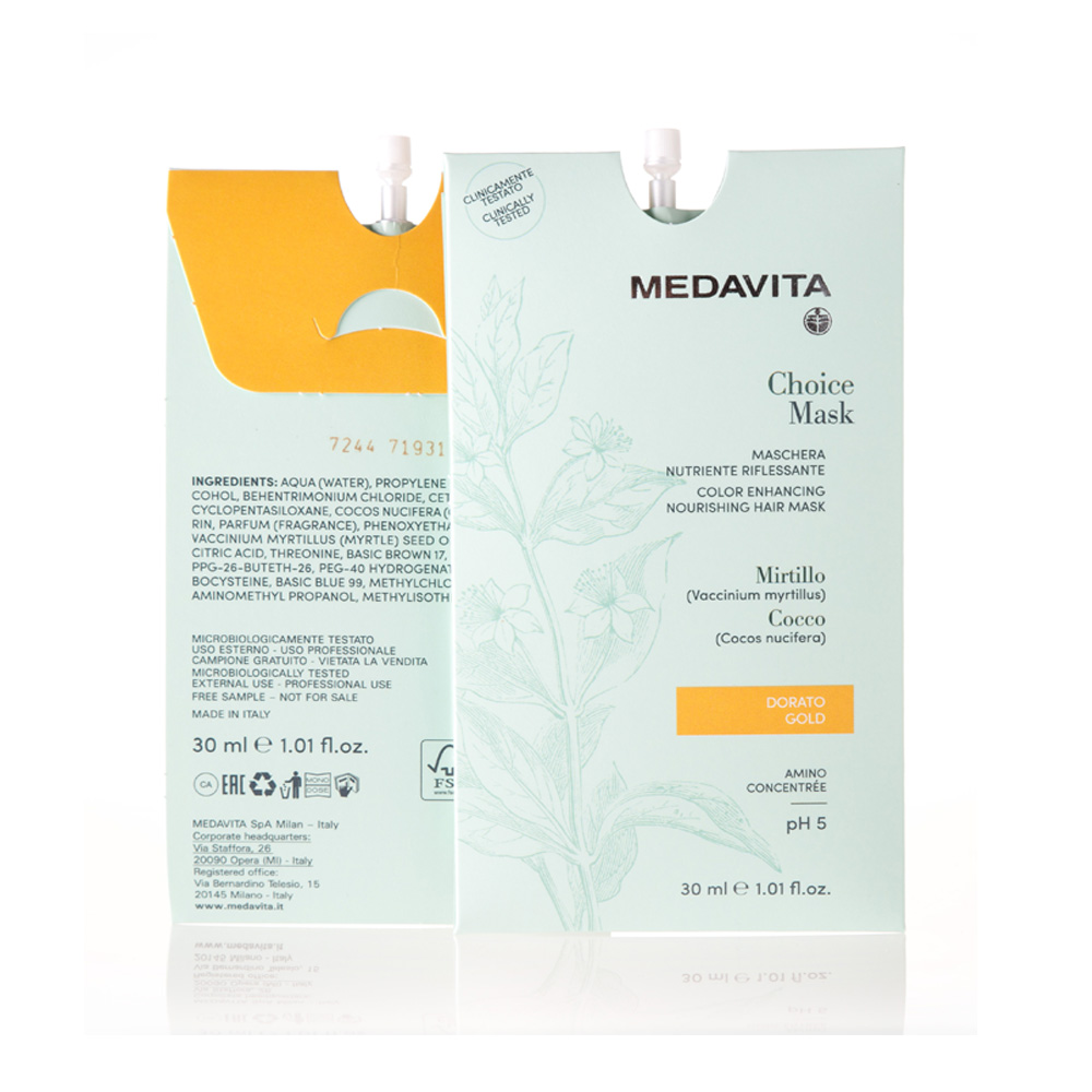 Цветна маска за коса Златно CHOICE MEDAVITA pH 3.5 подходящ за озаряване на цвета и гланц ефект блясък освежава златните нюанси на средно светли и светли коси грижа за цвета подходящ за финни коси