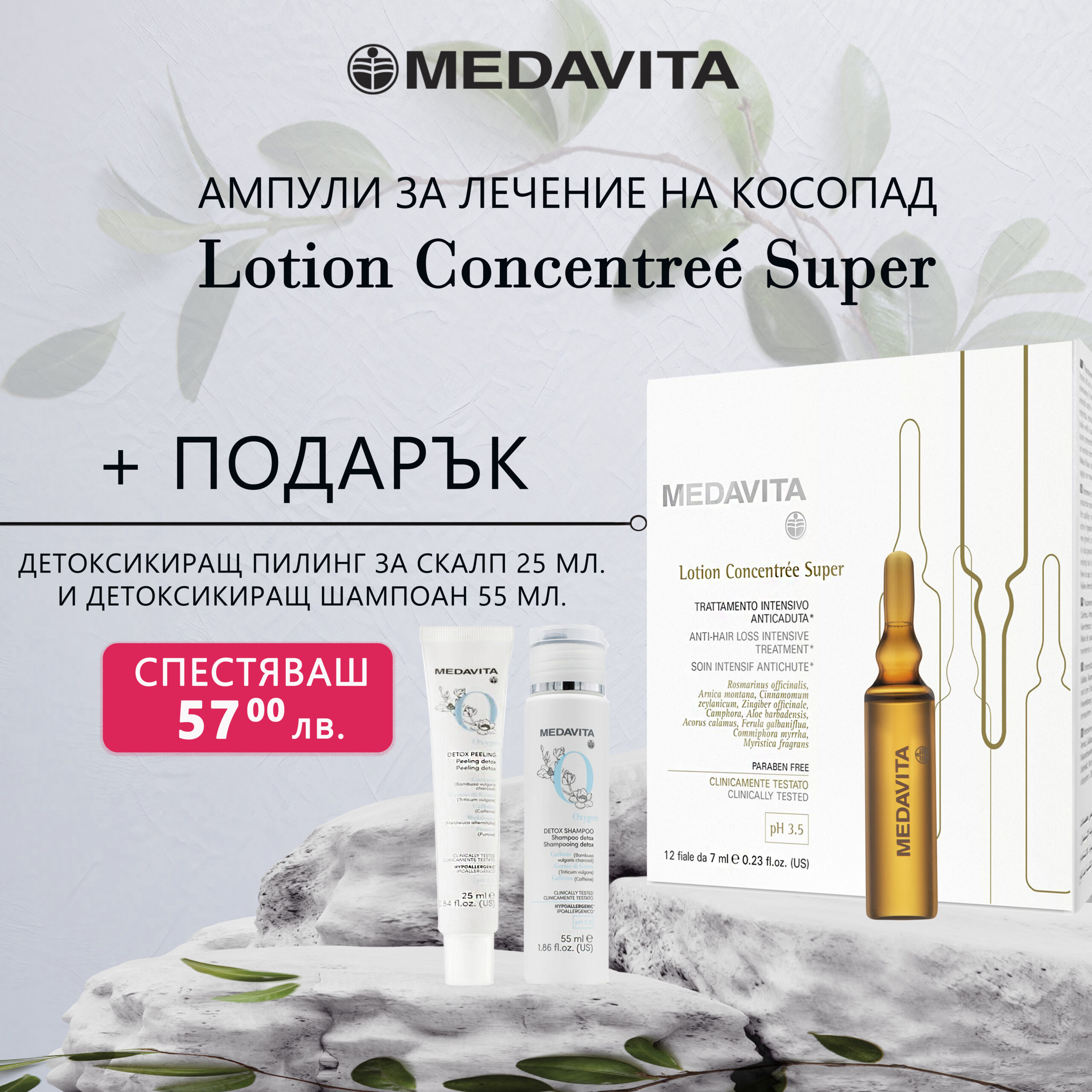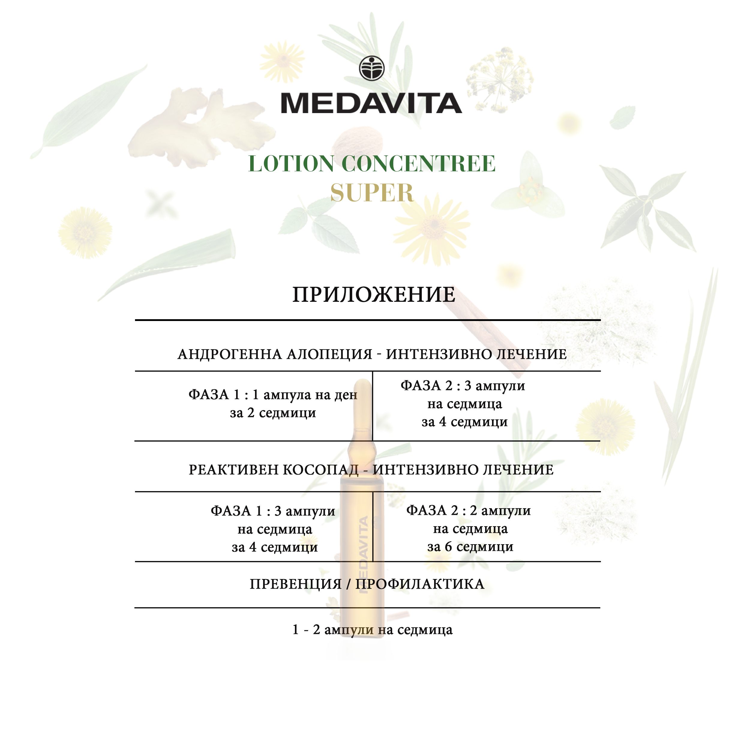 С ампули за косопад Super Lotion Concentree от Medavita залагате на резултати, подкрепени от наука, природа и клинични тестове. Насладете се на видимо по-гъста, здрава и жизнена коса още след първите седмици лечение.