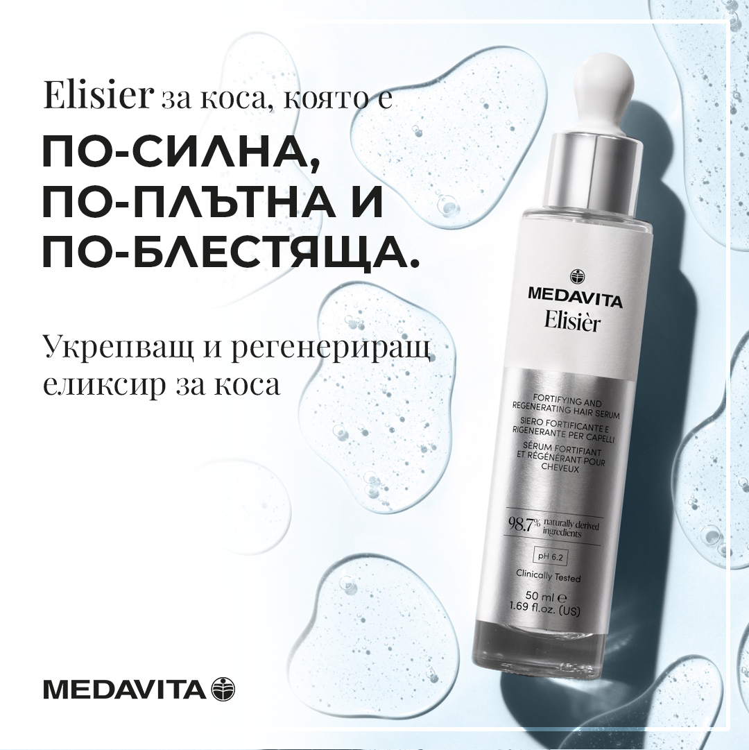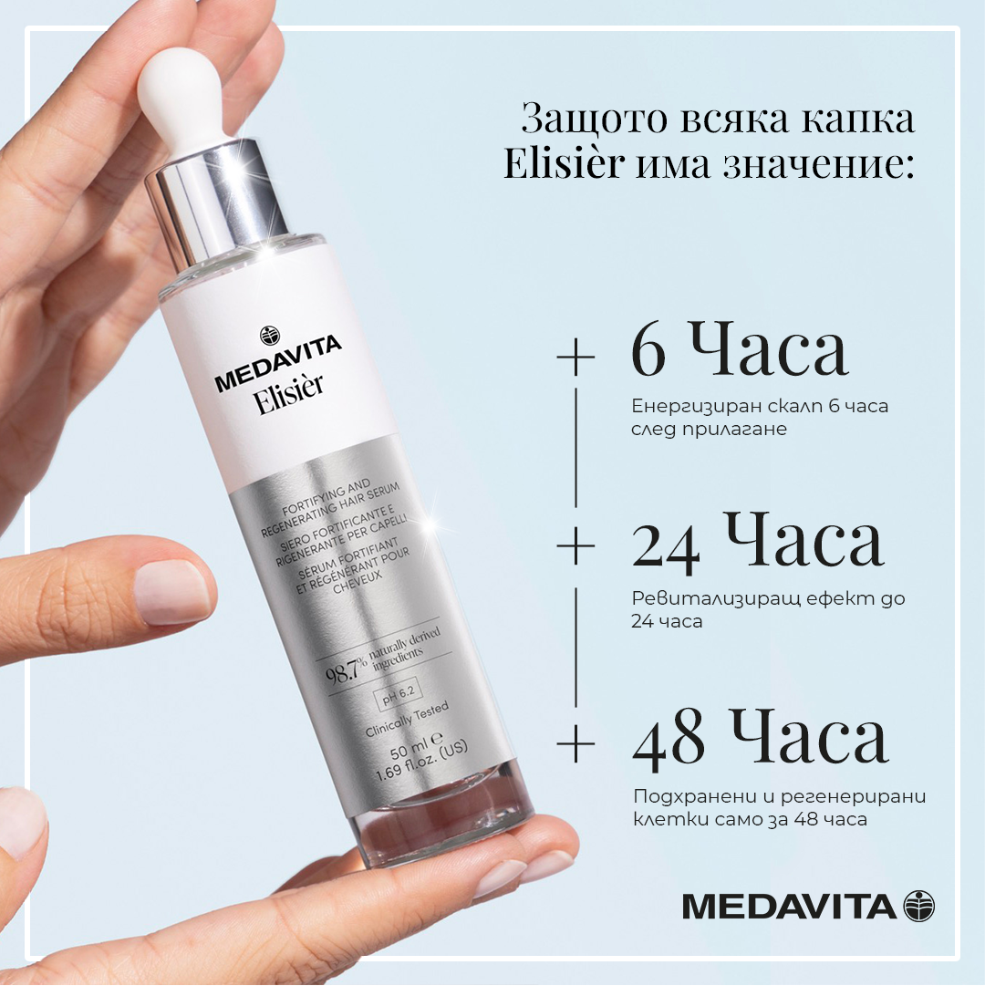 Elisiér серум за коса от Medavita е иновативна грижа, създадена да повиши здравината, устойчивостта и красотата на косата във всеки етап от живота. С формула, обогатена с активни съставки като хиалуронова киселина, кофеин, бизаболол и аминокиселини, този серум за коса осигурява интензивно подхранване и възстановяване само с няколко капки.