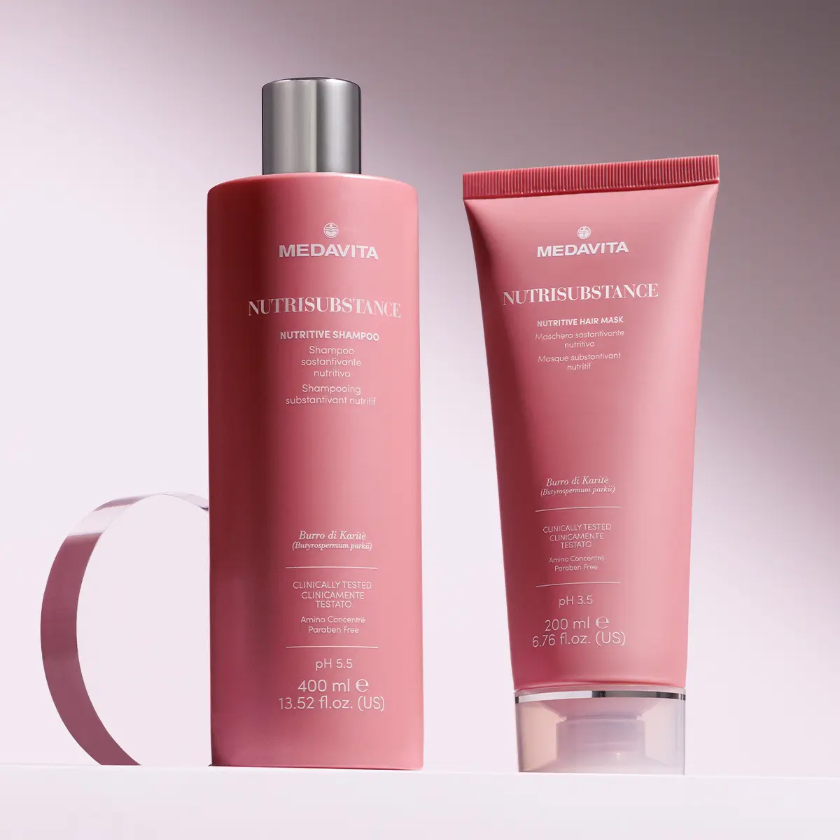Шампоан: нанесете с масажни движения върху скалпа и дължините. За оптимално активиране на съставките Medavita препоръчва да разтваряте шампоана с вода. Използвайте купичка или друг удобен съд сложете 1 част шампоан и 3 части вода разбъркайте и полейте върху вече мокрите скалп и коса с масажни движения създайте пяна, след което изплакнете с вода. След като изплакнете преминете към маска за коса Nutrisubstance.