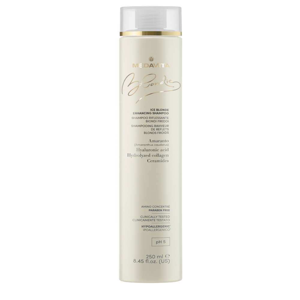 Шампоан за блондинки анти-жълто BLONDIE MEDAVITA pH 5 Студен нюанс анти-жълто ICE BLOND Шампоан за блондинки анти-жълто BLONDIE MEDAVITA Студен нюанс анти-жълто подходящ за блондирани коси и коси с изсветлени ефекти като балеаж, омбре и др. почиства деликатно анти-жълто студен нюанс за платинено русо специално разработен за нуждите на русата коса не утежнява подхранва и хидратира улеснява разплитането придава блясък Почиства, докато хидратира и подхранва. Специално разработен за специфичните нужди на русите коси. Съдържа мощен подхранващ комплекс от Хиалуронова киселина, Серамиди, Колаген