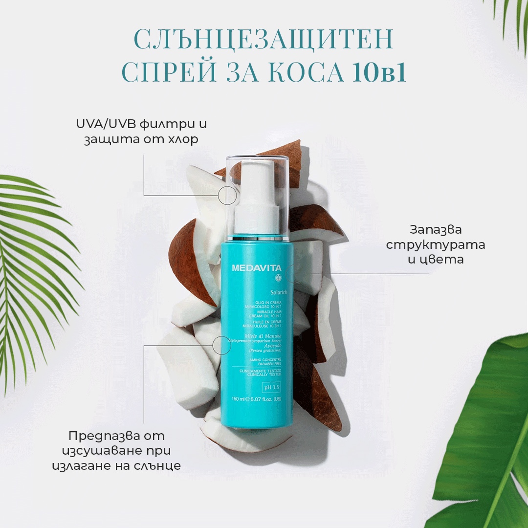 Слънцезащитен спрей за коса 10 в 1 SOLARICH съдържа:
